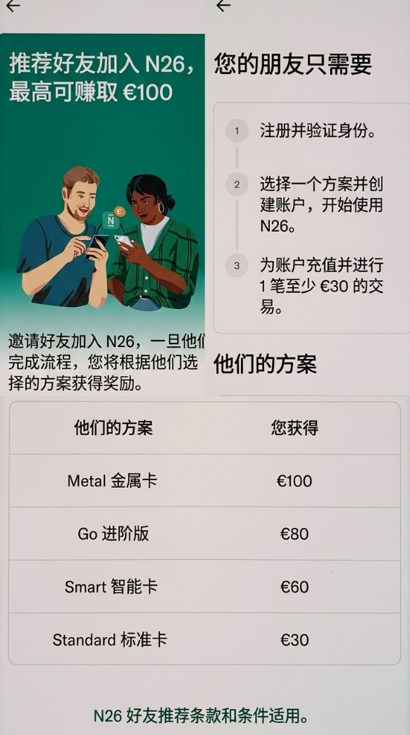- 操作说明: 告诉我你的 N26 用户名。返利金额随套餐动态波动(通常在 €30 - €200 之间),到账即分,诚信第一!